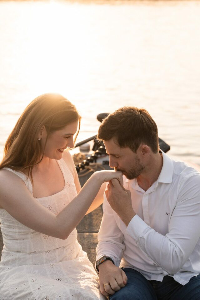 Em seguida, pegamos um barco e fomos até uma uma linda cachoeira no lago, um verdadeiro refúgio de tranquilidade. Com um toque de romantismo rústico, um barco repousava suavemente na água, convidando-nos a criar imagens que parecem saídas de um sonho. Cada olhar, cada abraço, foi imortalizado em meio à força e à beleza da natureza.