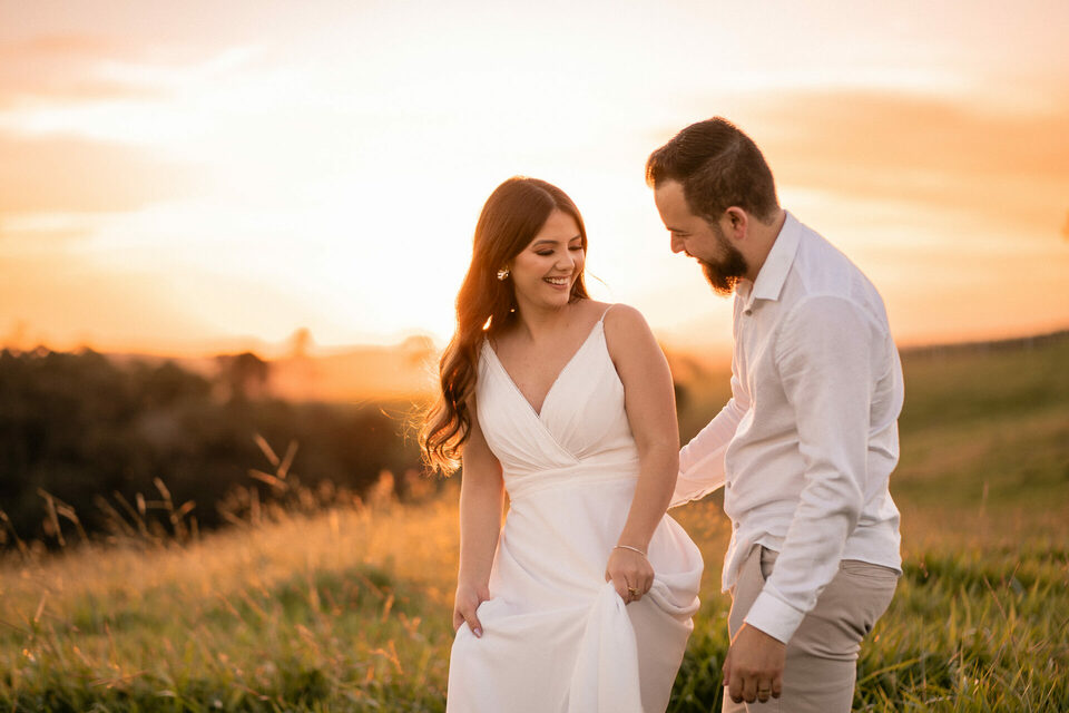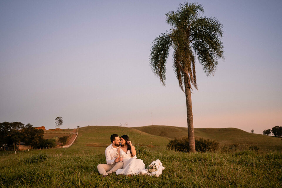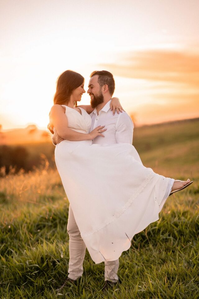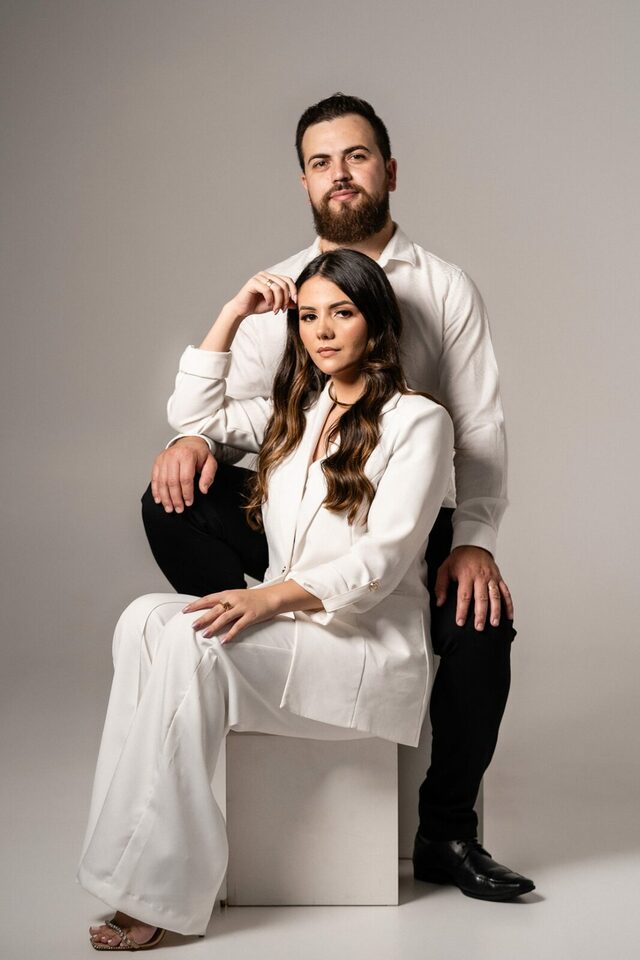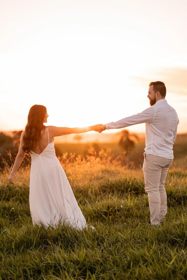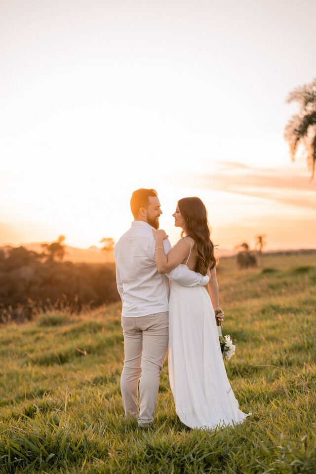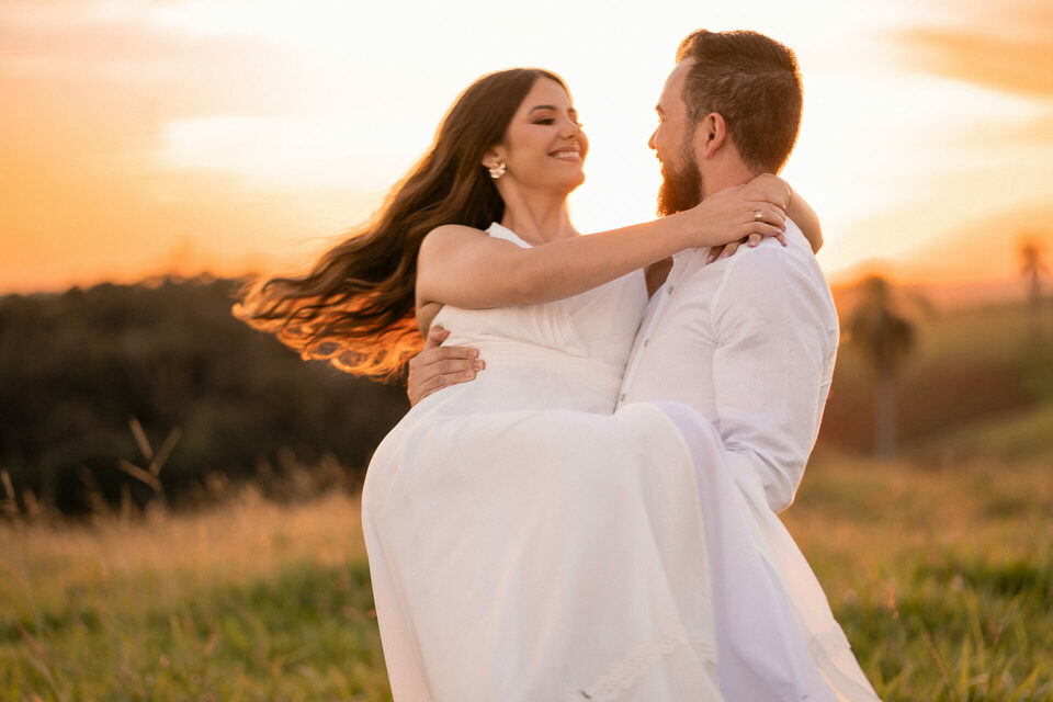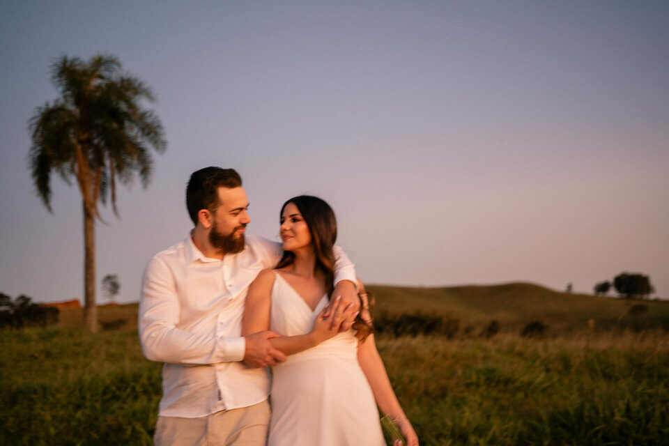 O casamento será na fazenda, com uma vista linda do por do sol. Na ideia de conhecer o local, resolvemos fazer o ensaio pré-casamento por lá também! Primeiro, alguns retratos aqui em nosso estúdio, fotos bem clássicas com uma pitadinha de diversão. Daqui partimos direto para Nova Esperança pegar o por do sol na fazenda. Mais romance, diversão e uma enxurrada de fotos desse lindo casal.